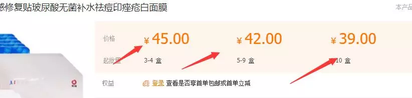 这款产品在阿里巴巴选用阶梯价格办法,买的越多,就越便宜,大于十盒是39的价格。终究联系上负责人,说要一次性收买300盒可以优惠多少,负责人报价32块钱,立刻成交。